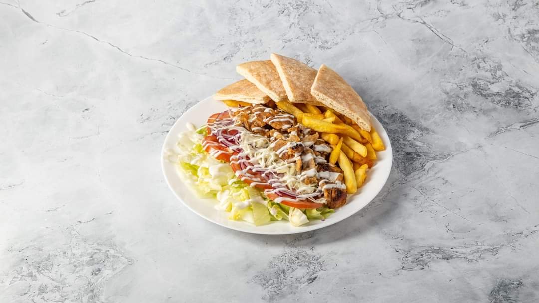Gyroshús, jégsaláta, paradicsom, lilahagyma, gyrosszósz, sültkrumpli, pita