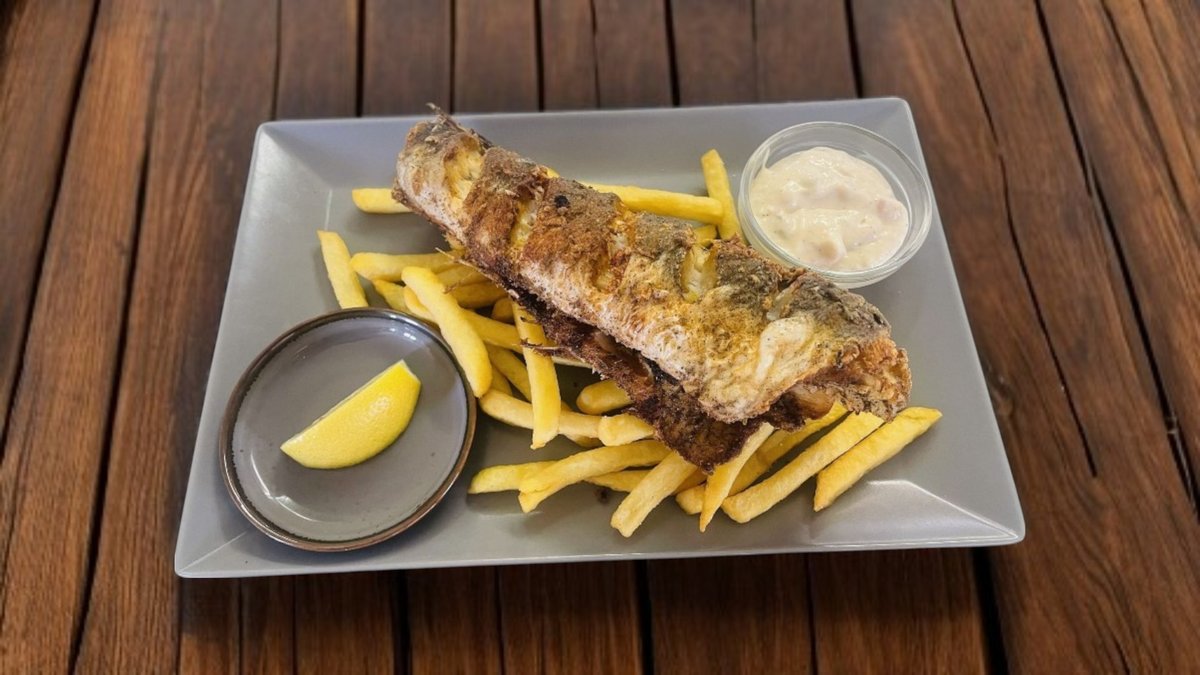Hekktörzs, hasábburgonya, remulademártás, citrom szelet.