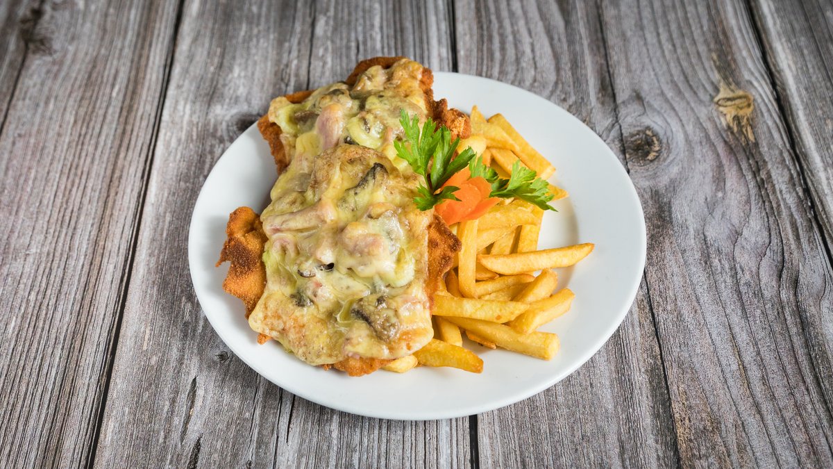 (Rántott csirkemell sonka, gomba, póréhagyma sajttal grillezve)