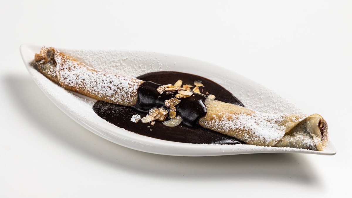 Diós és Kakaós piskóta, csokoládé szósz, vanília szósz, állati eredetű tejszínhab, pirított dió