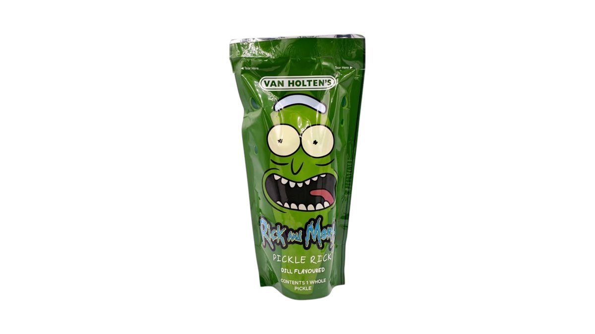 Van Holten’s Pickle Rick – Rick & Morty kiadás „IT’S PICKLE RICK!” 🥒💥 Az ikonikus Rick & Morty epizód ihlette óriás dill uborka praktikus zacskóban. Ropogós, savanykás és tele karakterrel – útközben is tökéletes nasi! Gluténmentes, zsírszegény, alacsony kalóriatartalmú.