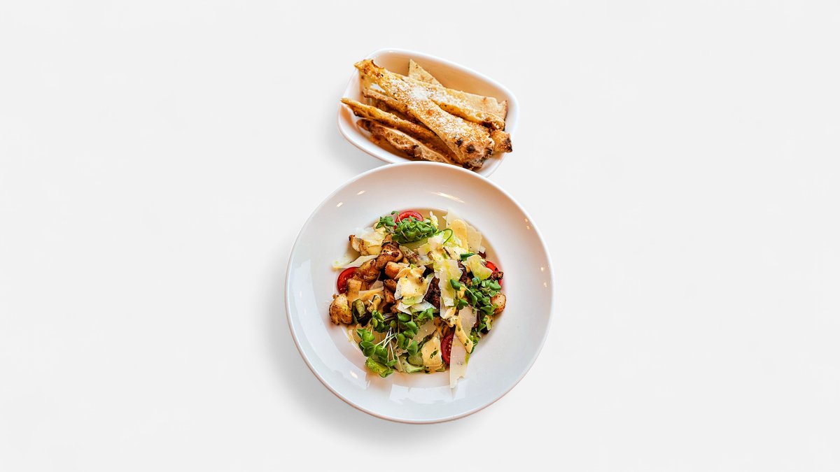szívsaláta, uborka, koktélparadicsom, csirkemell, guanciale, Paraszt Sajt kemény sajt, mojo szósz, sajtos pizzakenyér