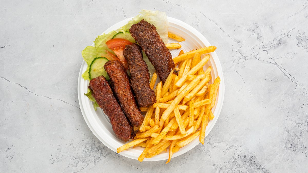 Faszénen sült, fűszeres darált húsrudak aranybarnára sült hasábburgonyával tálalva. Kívül ropogós, belül szaftos – tartalmas, ízgazdag fogás.