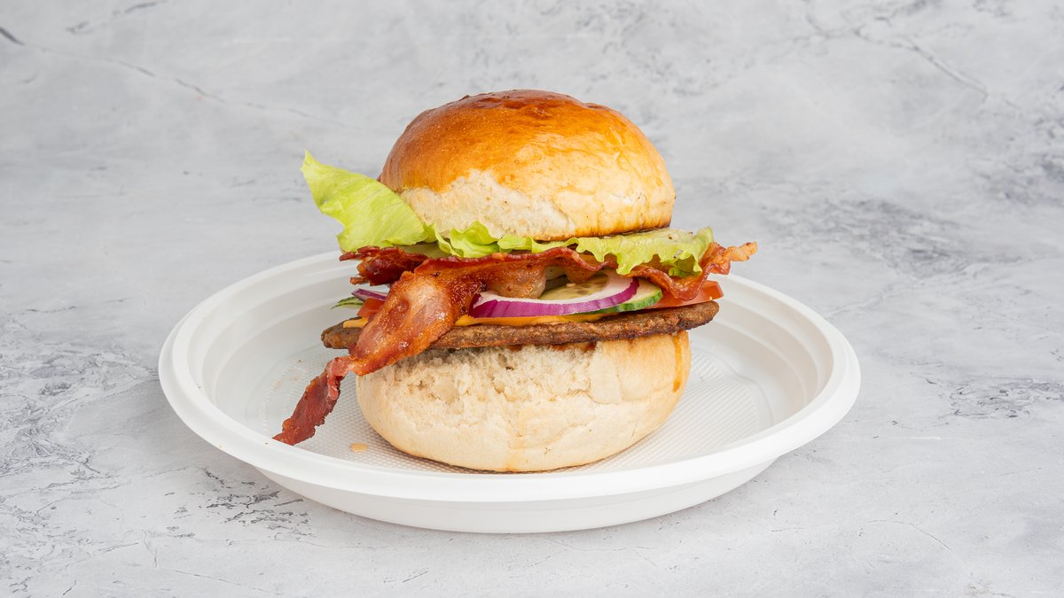 Juhtúrós, ropogós bacon szeletekkel, olvadt sajttal és friss zöldségekkel tálalt, ízletes marhahúspogácsával készült hamburger. Laktató és zamatos választás.