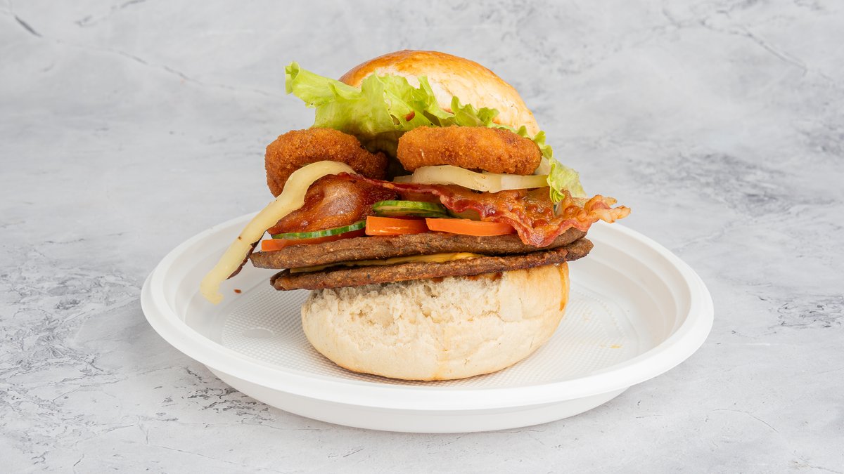 Duplahús sajt bacon rántott hagymakarika zöldségek saláta szószok