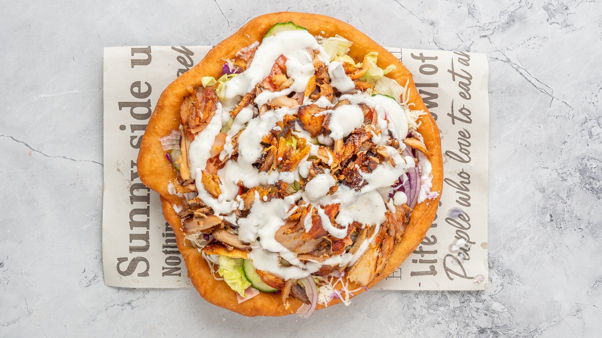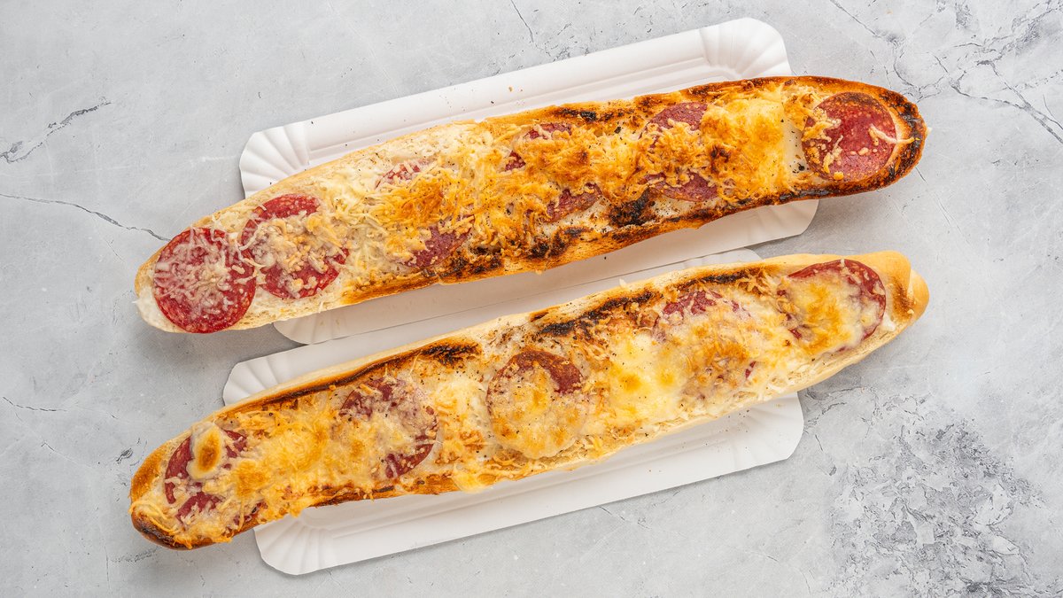 Ropogósra sült lángos pikáns szalámival, olvadt sajttal és friss lila hagymával töltve. Karakteres ízvilágú, tartalmas magyar kedvenc.