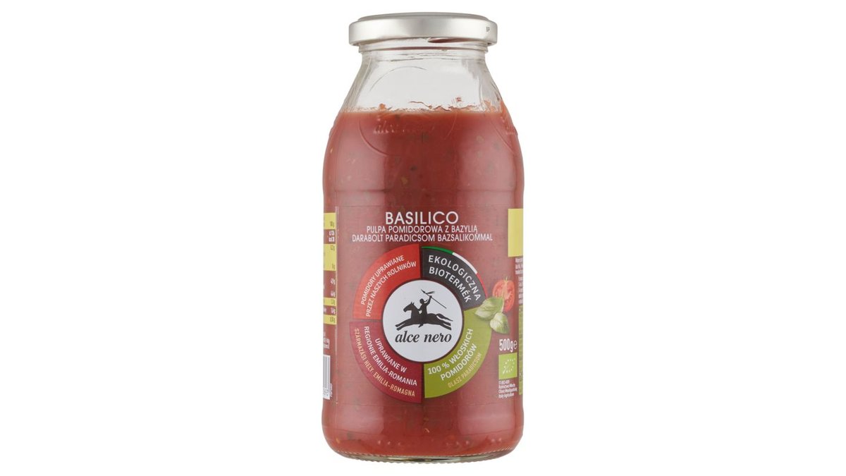 Alce Nero bio bazsalikomos paradicsompüré paradicsomdarabkákkal 500 g