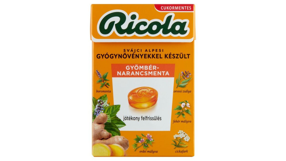 Ricola svájci alpesi gyógynövényekkel készült cukormentes gyömbér-narancsmenta cukorkák 40 g
