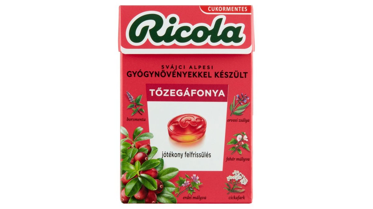 Ricola Tőzegáfonya cukormentes svájci gyógynövény cukorkák 40 g