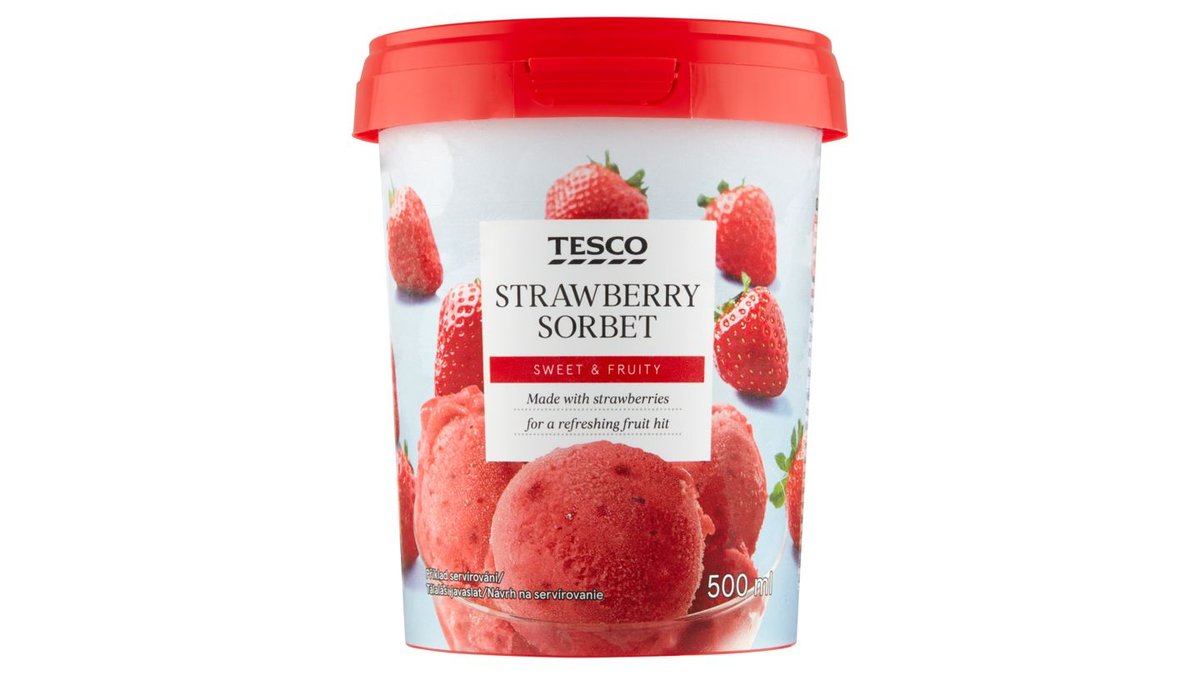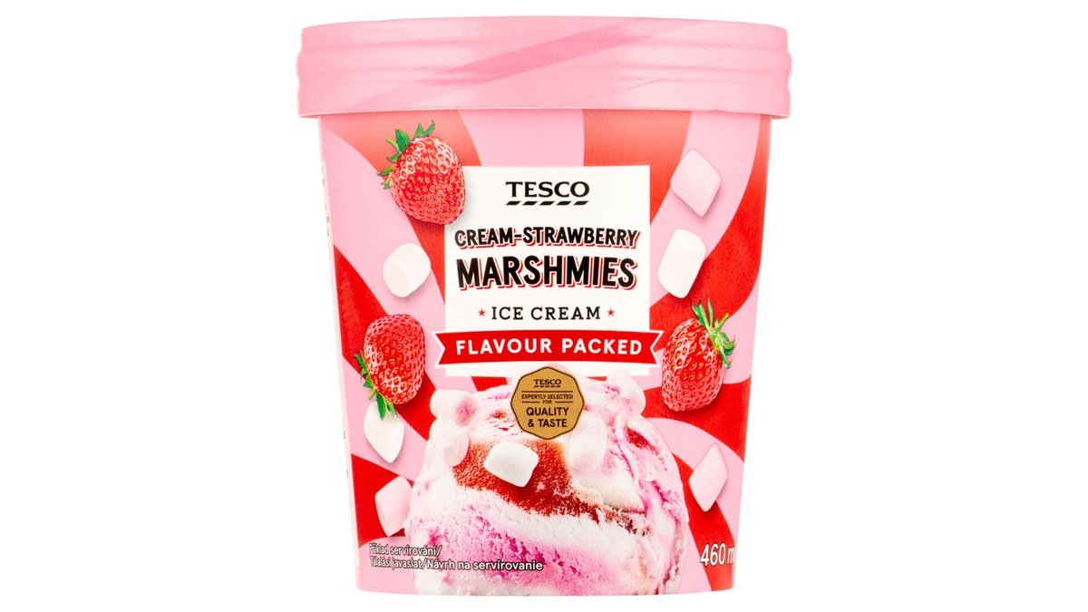 Tesco eperízű és tejszínes jégkrém epres öntettel és vaníliaízű pillecukorral 460 ml