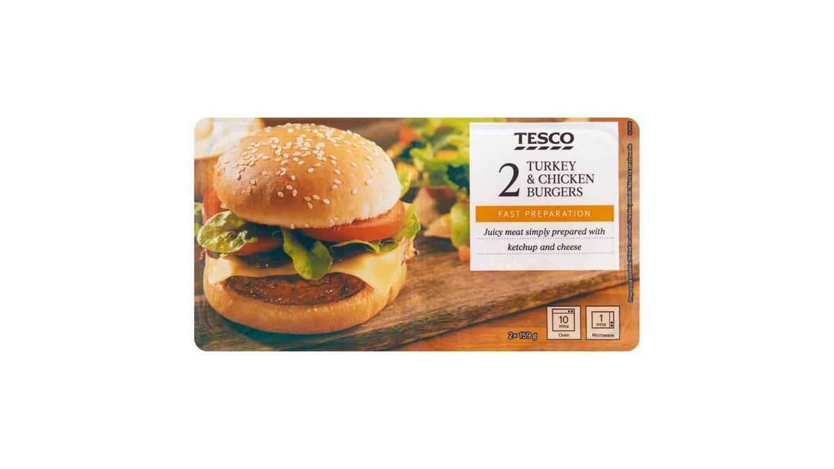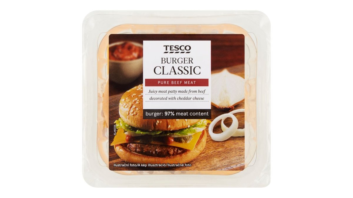Tesco csirke- és pulykahúsból készült húspogácsa hamburgerzsemlében, sajttal és ketchuppal 2 x 159 g