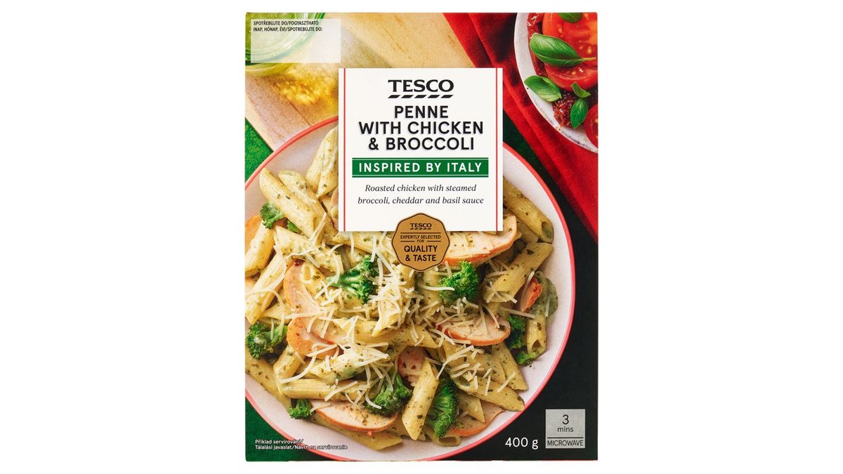 Tesco főtt penne tészta bazsalikomos szósszal, párolt csirkemelldarabokkal, brokkolival 400 g