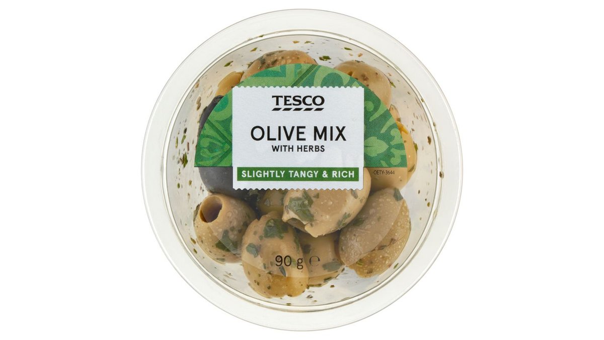 Tesco marinált, magozott zöld és fekete olívabogyó zöldfűszerekkel 90 g