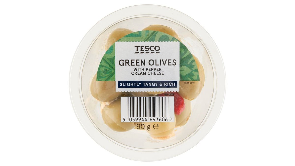 Tesco marinált magozott zöld olívabogyó paprikás krémsajttal töltve 90 g