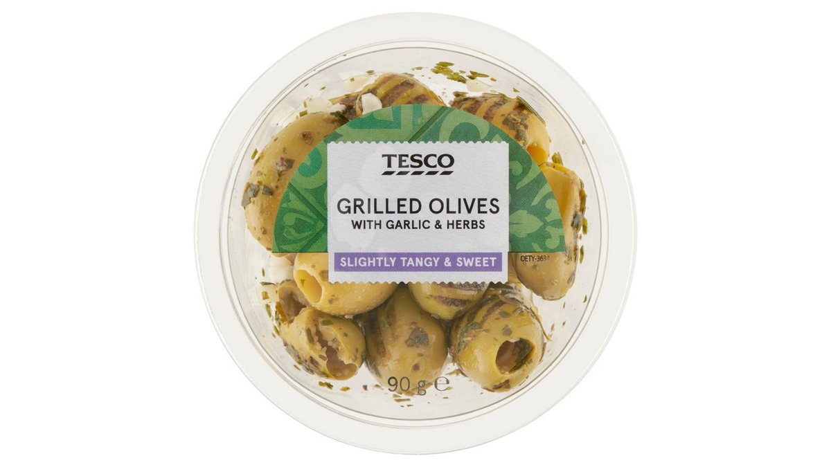 Tesco grillezett marinált magozott zöld olívabogyó fokhagymával és zöldfűszerekkel 90 g