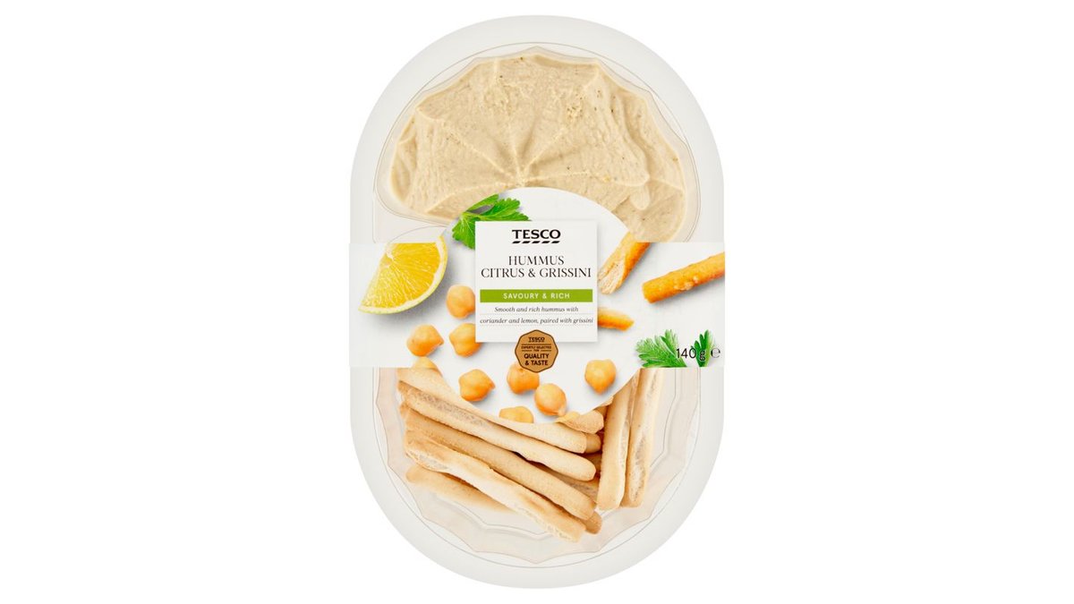 Tesco Hummus csicseriborsókrém szezámmagkrémmel, limelével és grissini kenyér rudacskákkal 140 g
