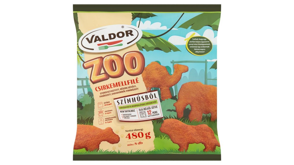Valdor Zoo gyorsfagyasztott, készre sütött, panírozott, darabokból formázott csirkemellfilé 480 g