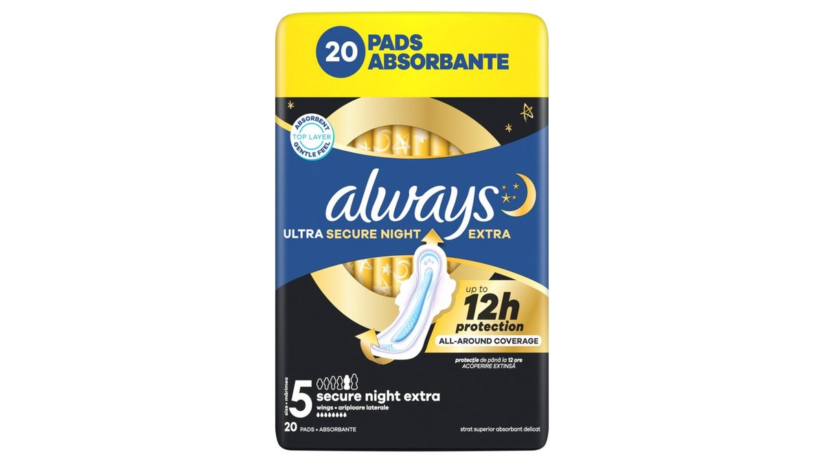 Always Ultra Secure Night Extra Egészségügyi Betét (5-ös Méret) Szárnyas Betét x 20]