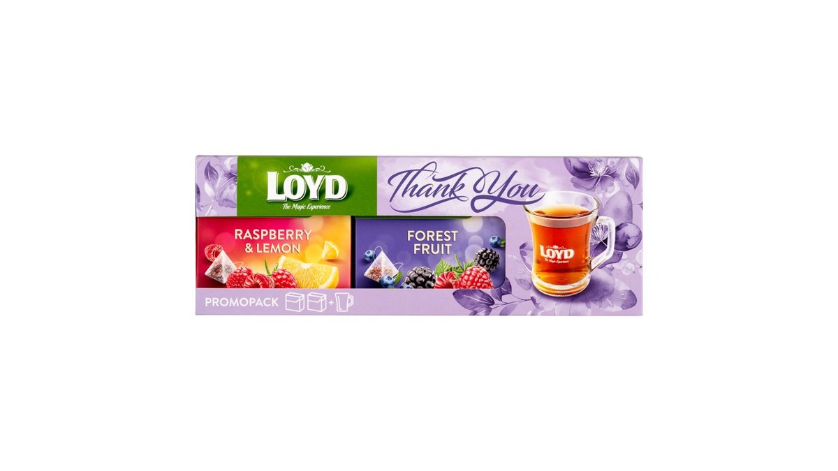 Loyd ajándék tea csomag Erdei gyümölcs + Málna-citrom ízű gyümölcstea 80 g + pohár