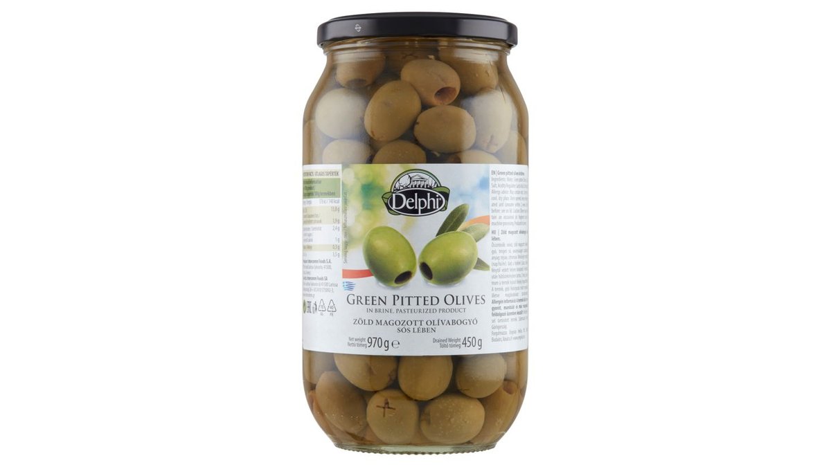 Delphi zöld magozott olívabogyó sós lében 970 g
