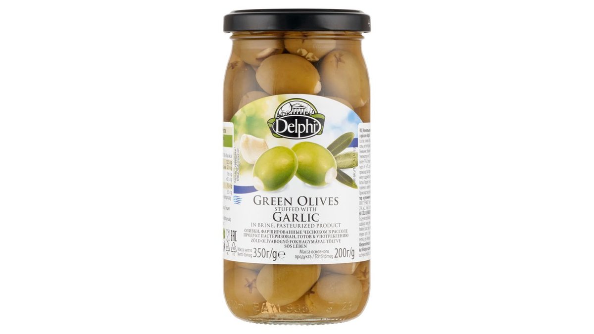 Delphi zöld olívabogyó fokhagymával töltve sós lében 350 g