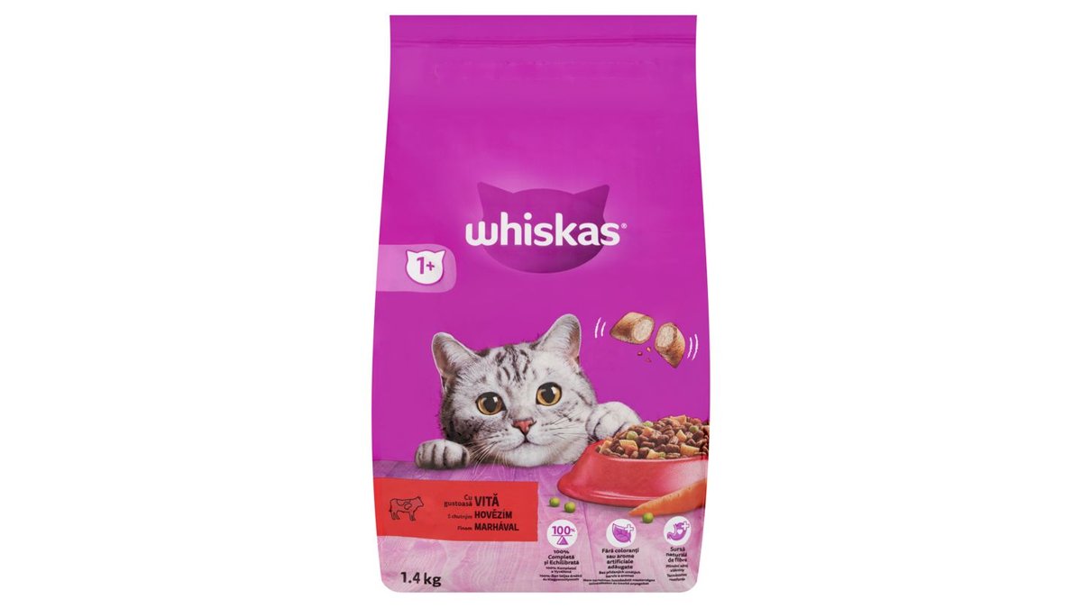 Whiskas 1+ teljes értékű szárazeledel felnőtt macskák számára marhával 1,4 kg