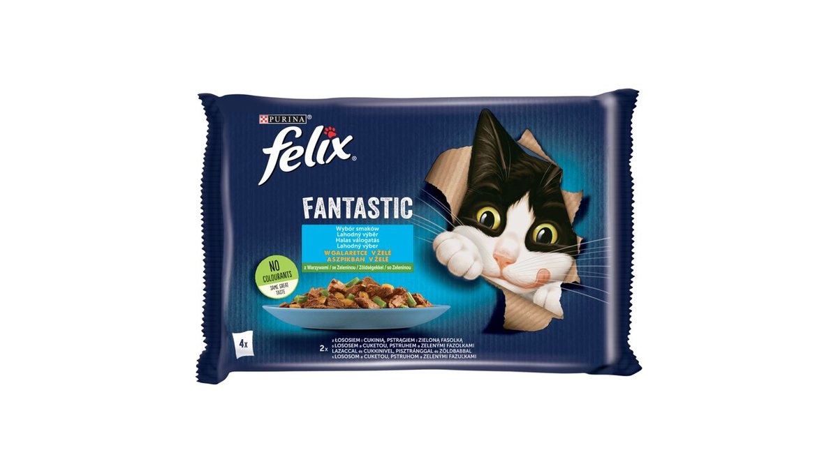 Purina Felix Fantastic lazaccal, cukkinivel/pisztránggal, zöldbabbal aszpikban macskaeledel 4 x 85 g