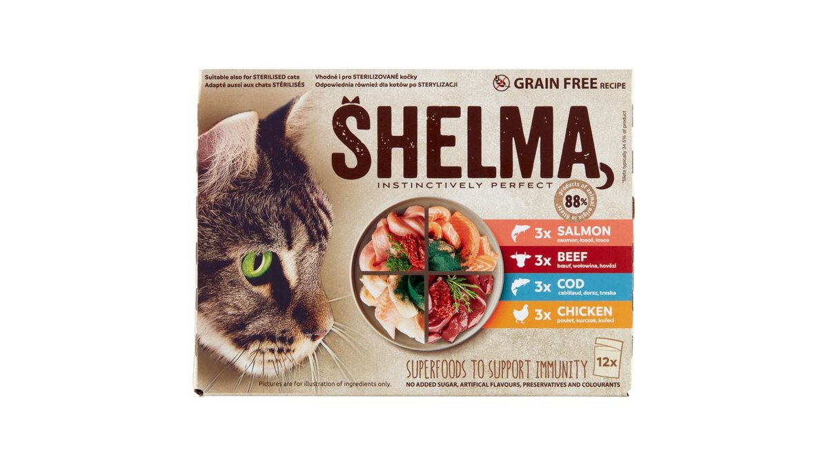 Shelma nedves macskaeledel felnőtt macskának gabonamentes párolt filé alutasakos macskatáp 12 x 85 g