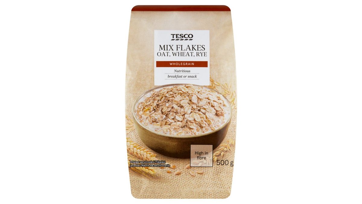 Tesco teljes kiőrlésű zab-, búza- és rozspelyhek keveréke 500 g