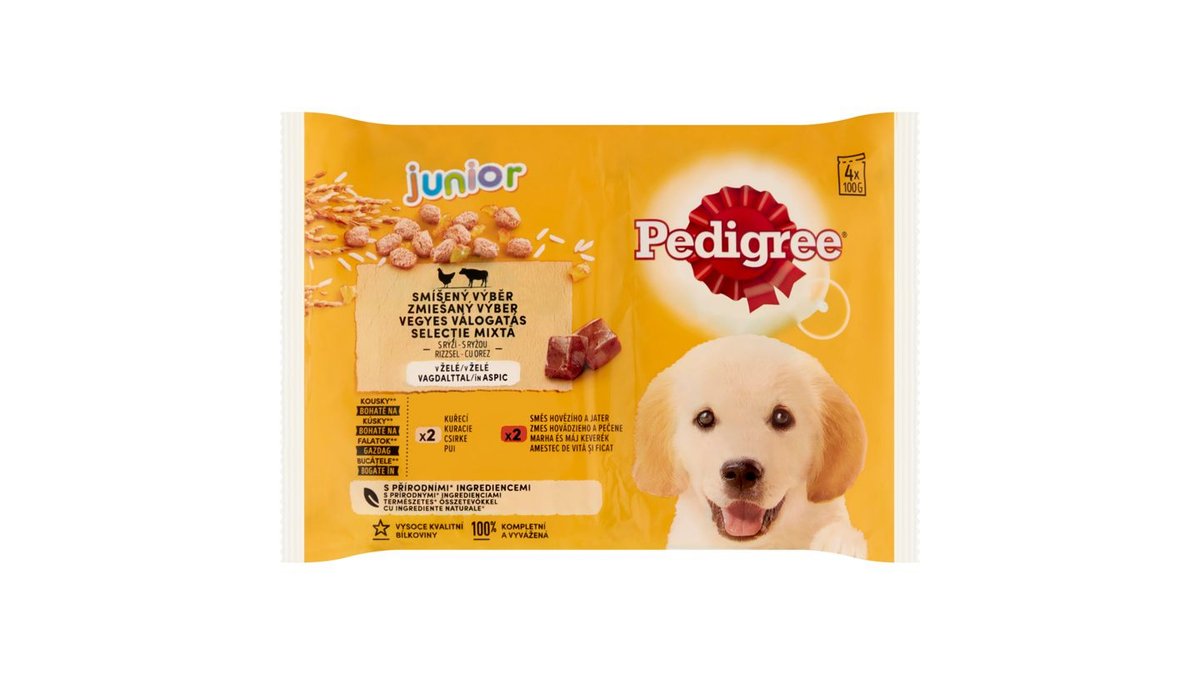 Pedigree Junior teljes értékű vegyes válogatás eledel kölyöknek rizzsel vagdalttal (4 x 100 g), 400 g