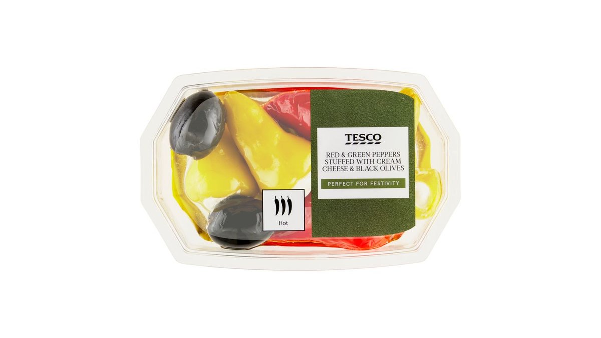 Tesco krémsajttal töltött marinált zöld és piros paprika és fekete olívabogyó repceolajban 150 g