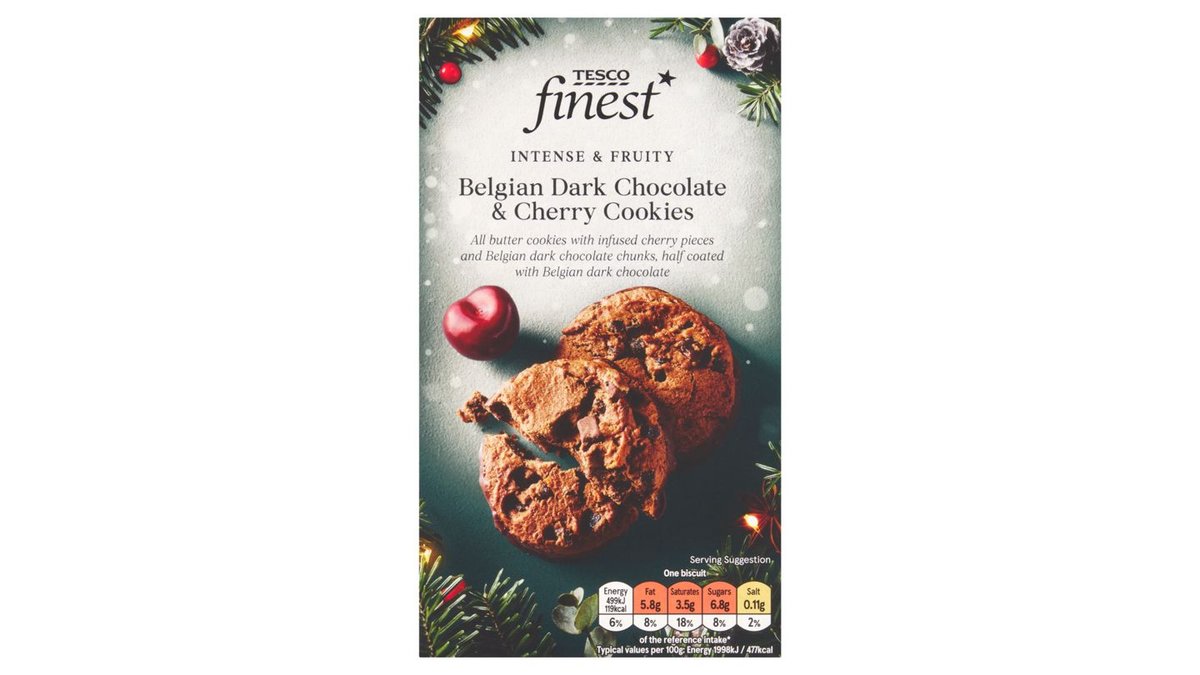 Tesco Finest vajas keksz meggy darabokkal és belga étcsokoládé darabokkal 200 g