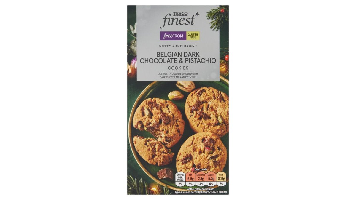 Tesco Finest Free From gluténmentes vajas keksz belga étcsokoládé darabokkal és pisztáciával 150 g