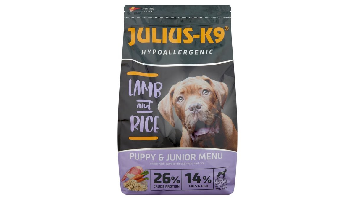 Julius-K9 Hypoallergenic Puppy & Junior Menu teljes értékű kutyaeledel báránnyal és rizzsel 3 kg