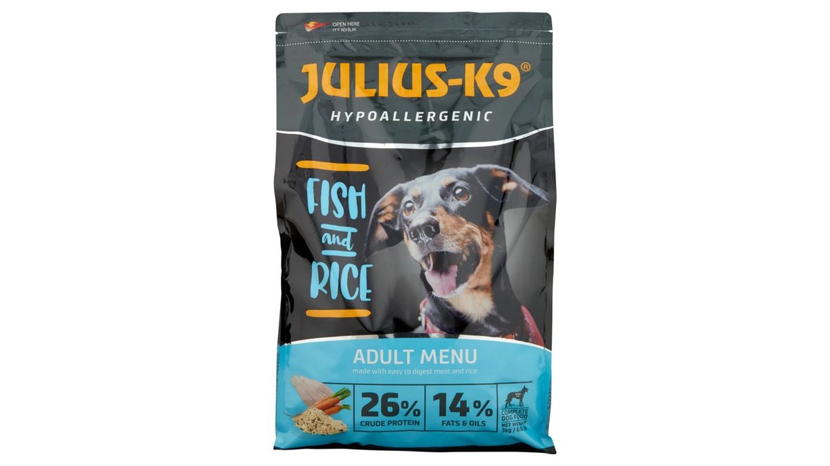 Julius-K9 Hypoallergenic Adult Menu teljes értékű kutyaeledel hallal és rizzsel 3 kg