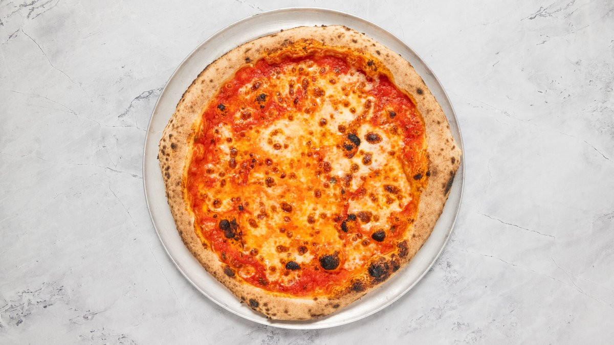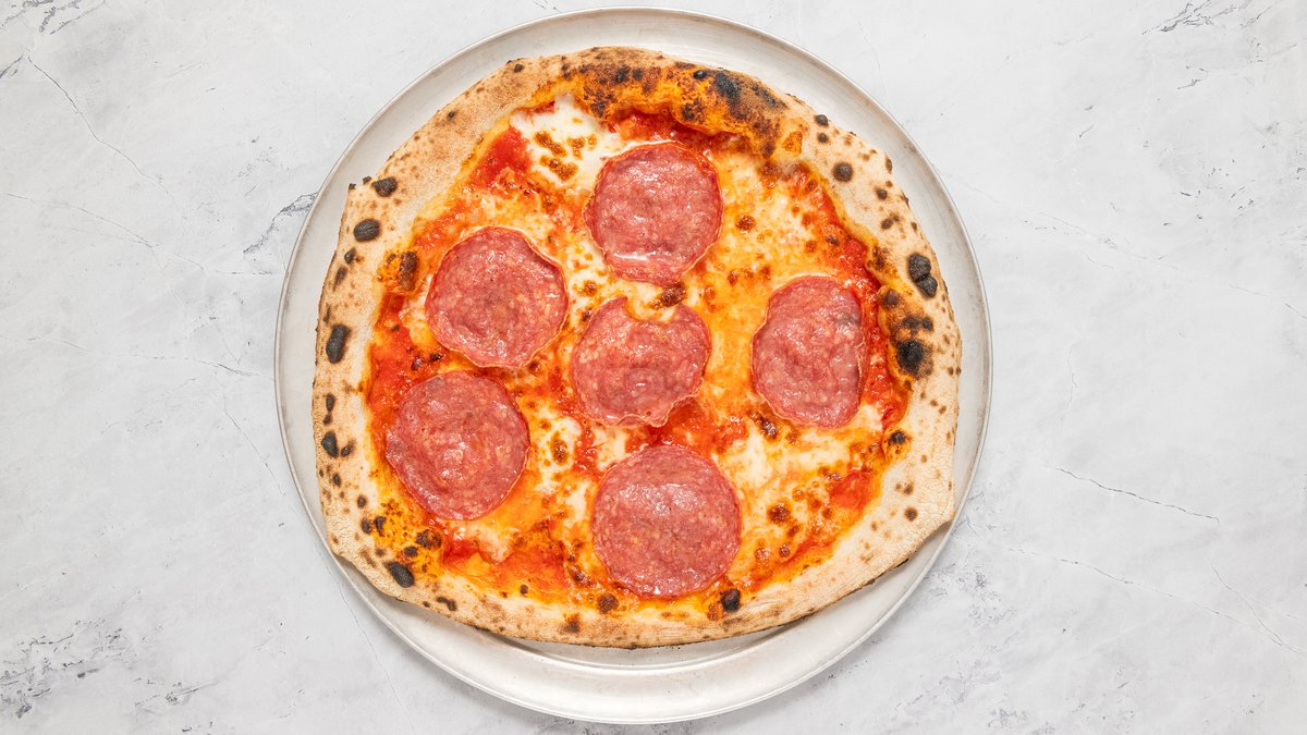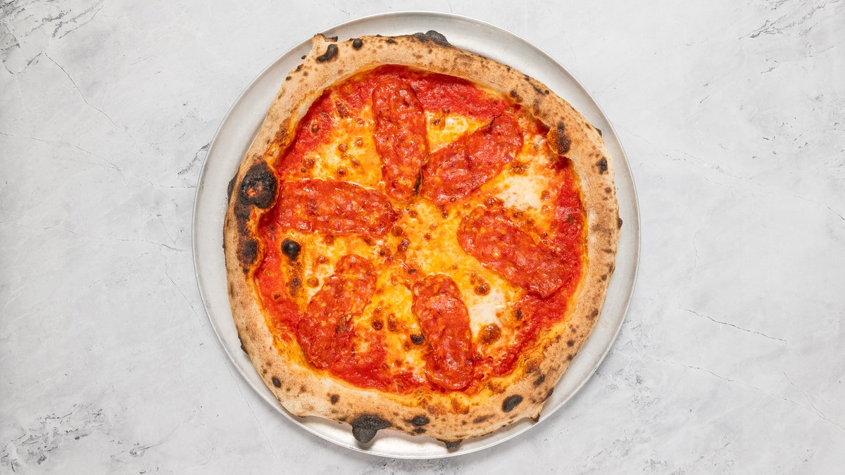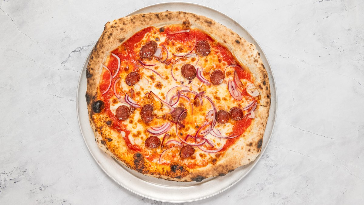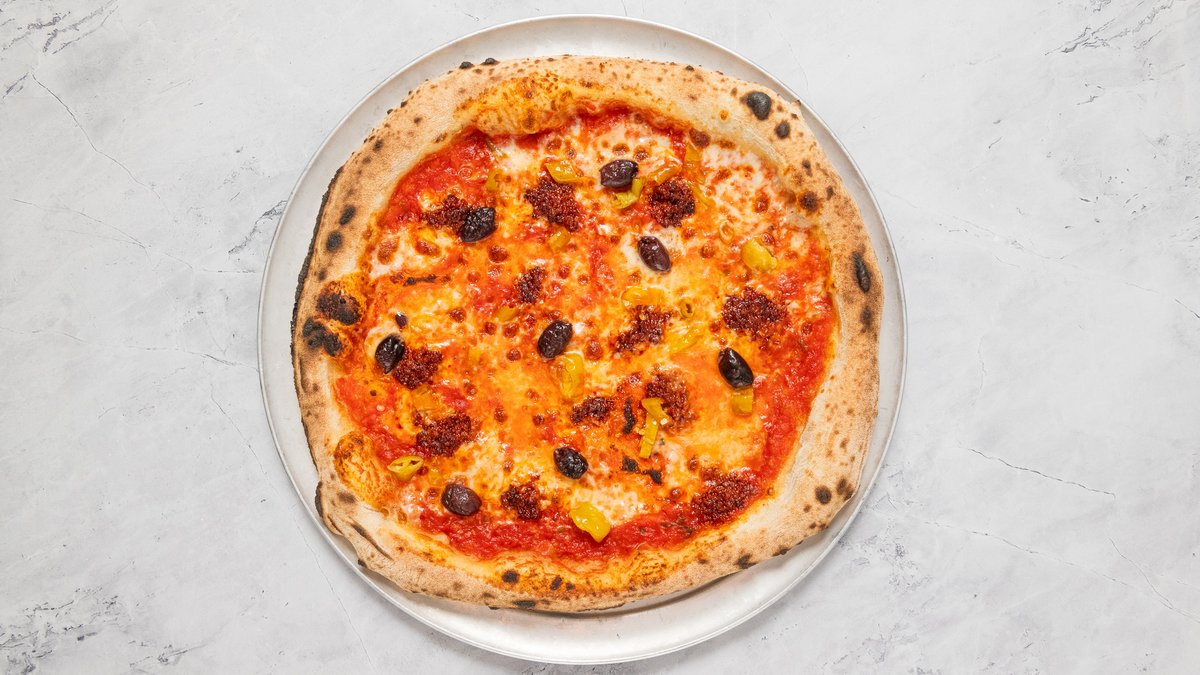 San Marzano DOP paradicsom, Parmigiano Reggiano, Fior di Latte, ’Nduja, pepperoni, Kalamata olivabogyó, bazsalikom