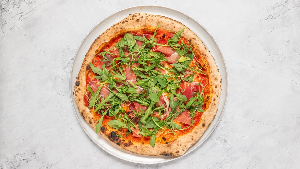 San Marzano DOP paradicsom, Parmigiano Reggiano, Fior di Latte, Proscuitto Crudo, rukkola