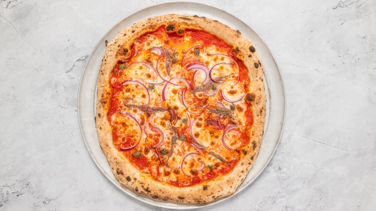 San Marzano DOP paradicsom, Parmigiano Reggiano, Fior di Latte, szardellák, kapribogyó, lilahagyma, bazsalikom