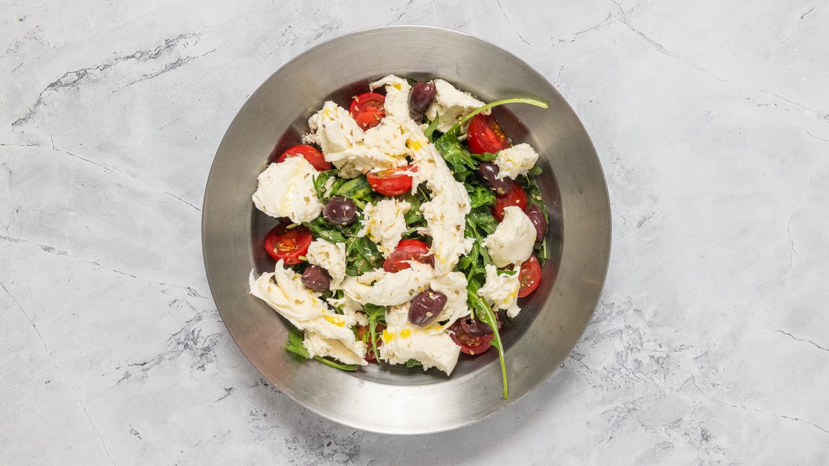 Rukkola, citrusos vinaigrette, koktél paradicsom, tépett Burrata, Kalamata olivabogyó