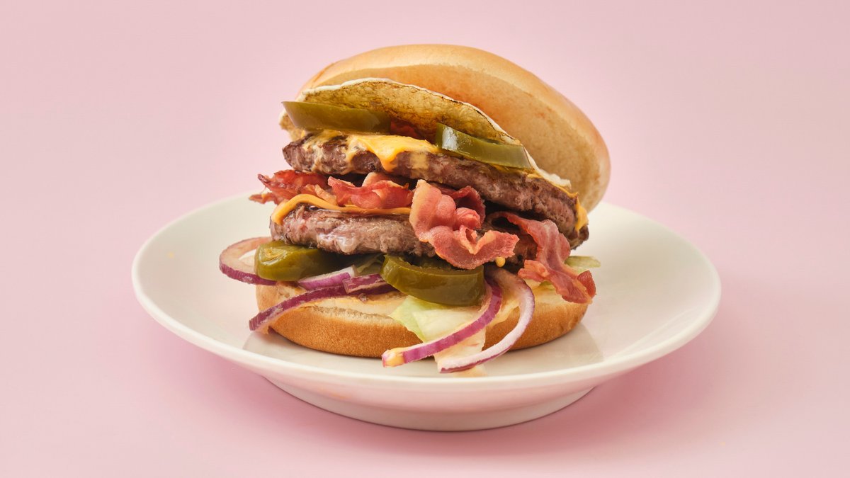 Tvöfalt kjöt, tvöfaldur ostur, beikon, sterkir jalapeno, egg, kál, gúrka og rauðlaukur.
