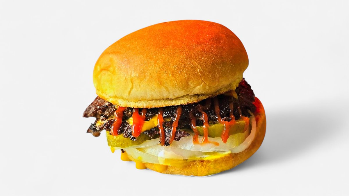 Majones, sætt sinnep, laukur, pickles, tvöfalt buff, tvöfaldur ostur og tómatsósa.