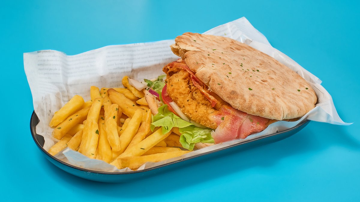 Stökkt kjúklingakjöt & beikon í lepinja með tómatsósu, majónesi og fersku grænmeti.