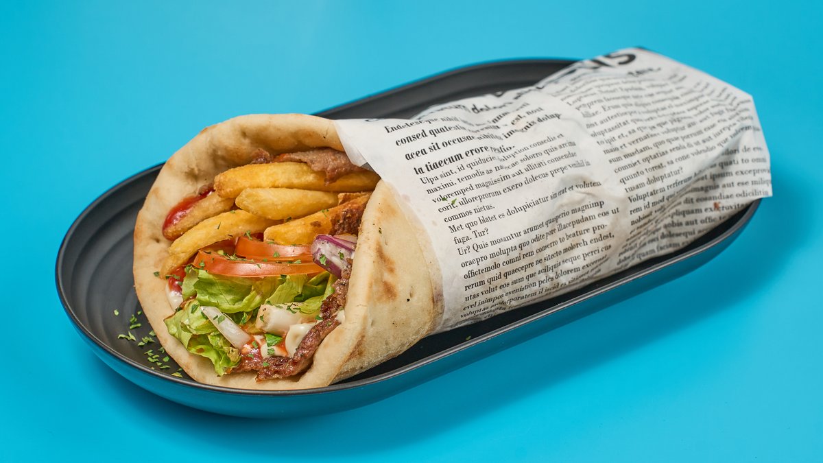 Hakkkebab úr lamb & naut eða svín & naut, í grísku brauði með grænmeti, tzatziki, tomato sauce og frönskum.