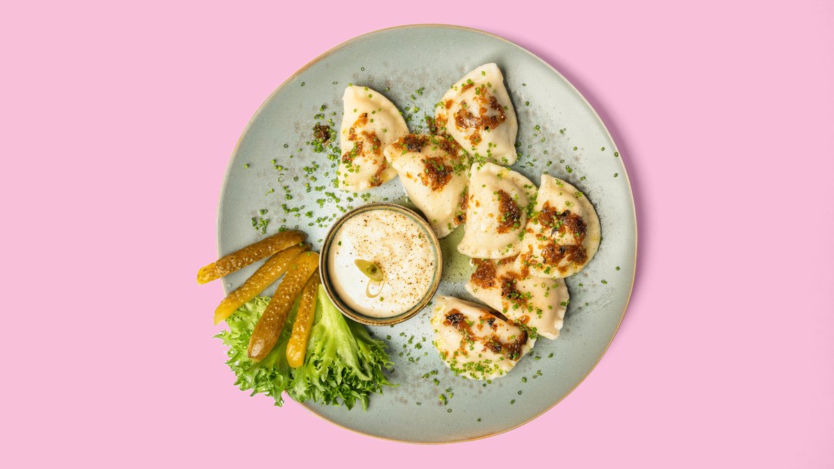 All dumplings served with caramelised onion on the top and sour cucumbers, side salad and cream on the side.