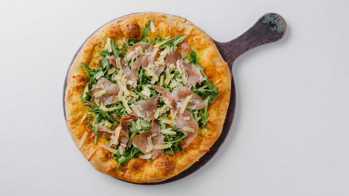 Hráskinka, Burrata Stracciatella ostur, klettasalat og eðal Feykir 12+ á toppnum. Hvítlaukssmjör og Shake&Pizza ostablandan.