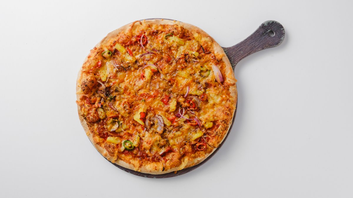 Ferskur Carolina Reaper, ferskur blandaður chili, Szechuan úr kvörn, pepperoni, ananas, rauðlaukur og S&P ostablanda.