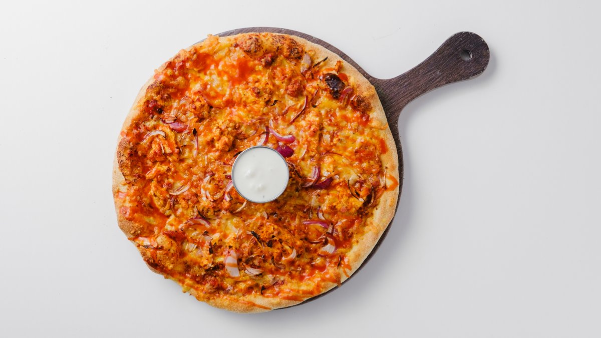 Buffalo kjúklingur, beikonkurl og rauðlaukur. Pizzasósan okkar og Shake&Pizza ostablandan. Hot sósa á toppnum og gráðaostasósa til hliðar.
