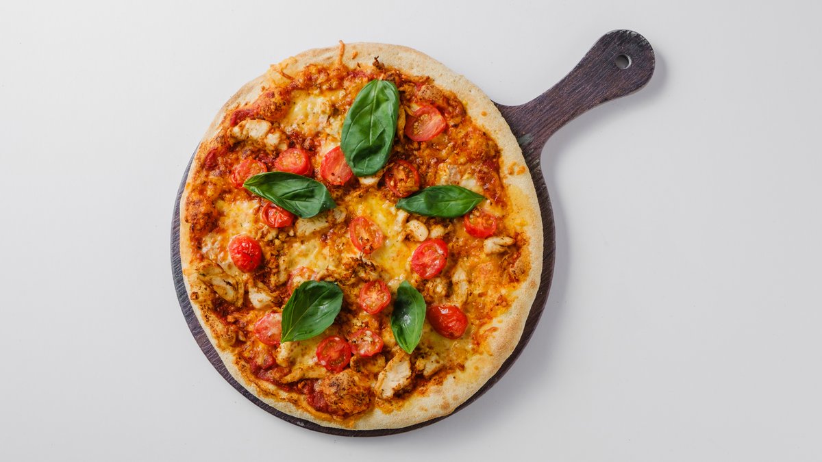 Fajitas kjúklingur, Burrata Stracciatella ostur, kirsuberjatómatar, hvítlaukur og ferskt basil. Pizzasósan okkar og Shake&Pizza ostablandan.