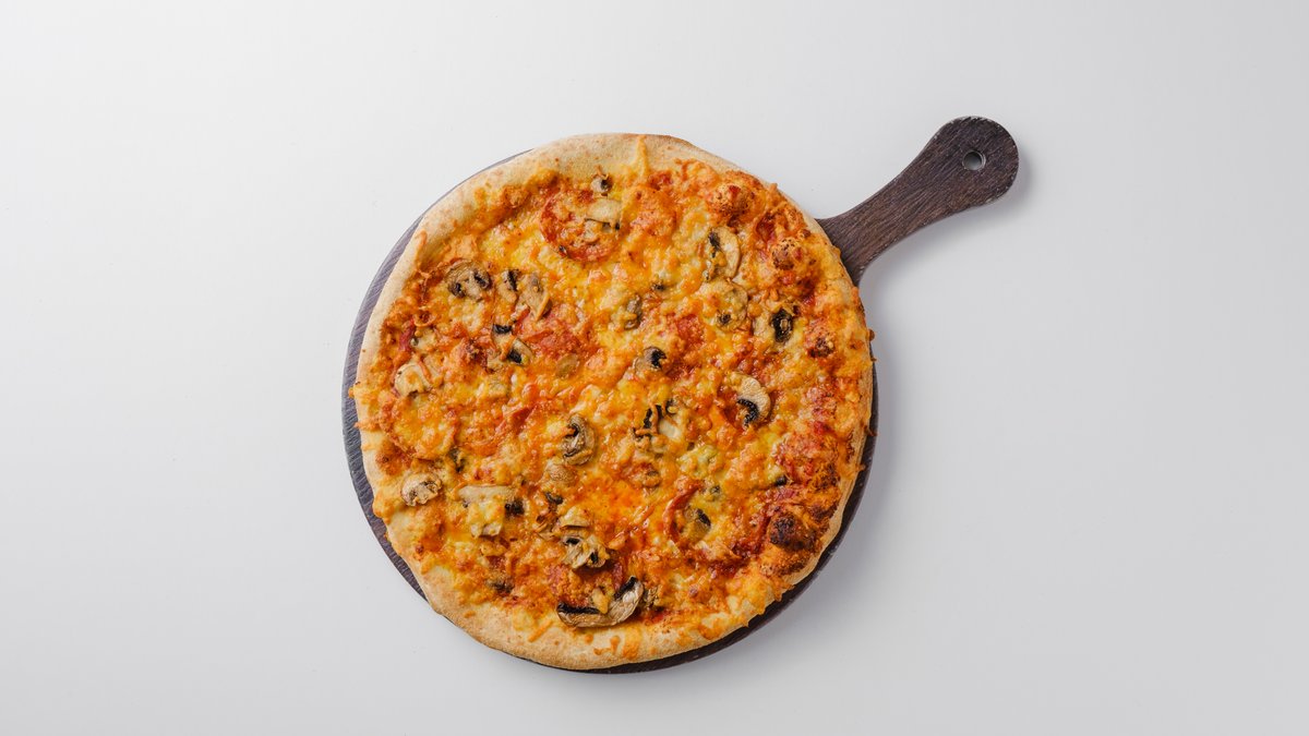 Pepperoni, rjómaostur, sveppir, svartar ólífur, svartur pipar og hvítlaukur. Pizzasósan okkar og Shake&Pizza ostablandan.