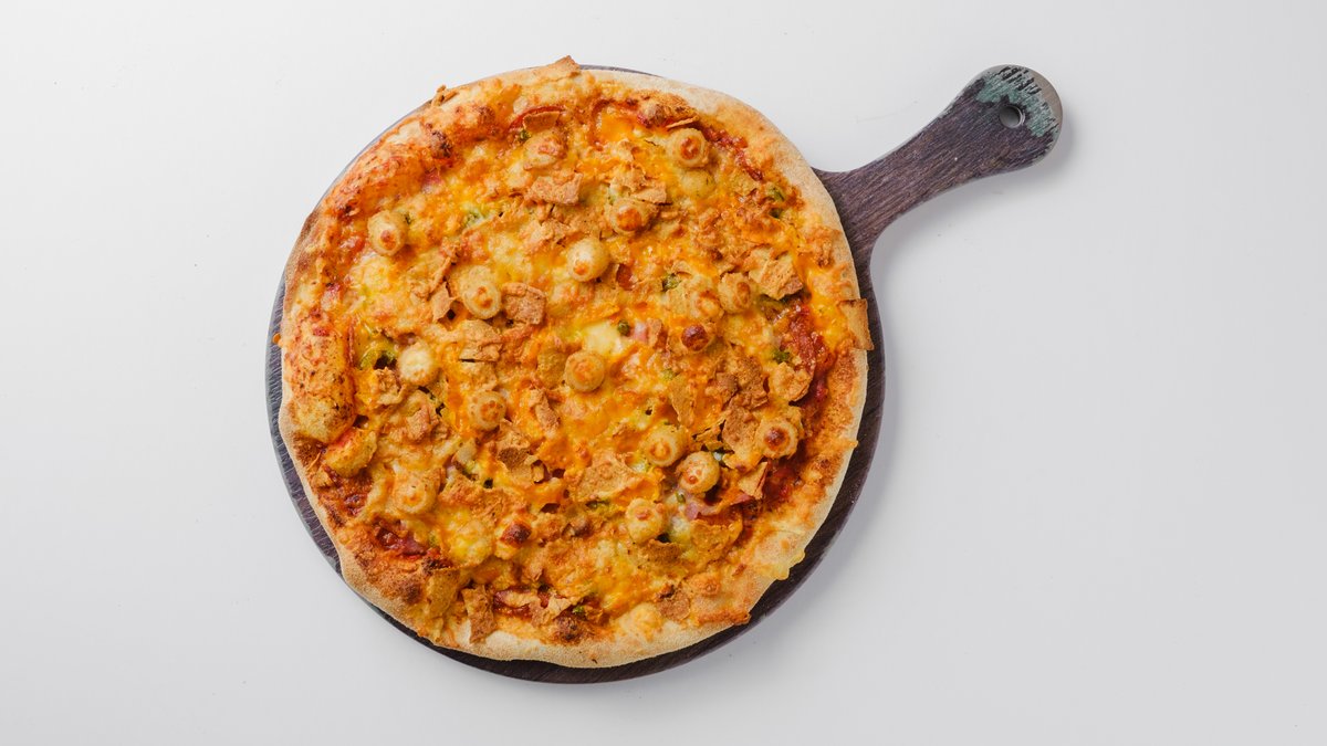 Engin botnsósa heldur beikonsulta. Pepperoni, fajitas kjúklingur, jalapenjó og Shake&Pizza ostablandan. Nachos og hvítlaukssósa á toppnum.